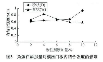 1)為了研究角蛋白改性劑對板材性能的影響,分別添加粉(D)、膏(W)狀角蛋白改性劑,添加量均為2%、4%、6%、8%和10%壓制模壓板進行單因素試驗,測定其靜曲強度、內結合強度、表面結合強度、吸水厚度膨脹率和甲醛釋放量等,確定制作吸塑門板的較優方案。
