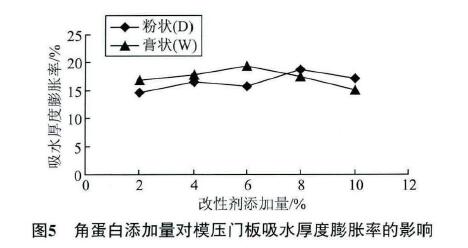 圖5是角蛋白改性劑對板材吸水厚度膨脹率的影響結果,可以看m隨著改性劑添加量的增加,吸水厚度膨脹率也整體呈上升趨勢。當添加量小于8%,W型添加劑吸水厚度膨脹率明顯大于D型添加劑,由數據分析可知,較優方案為D型添加量20/0。隨著改性劑添加量的增加,很過一定范圍后,吸水厚度膨脹率整體呈下降趨勢。