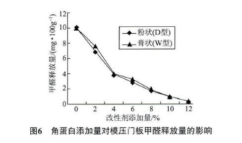 甲醛釋放量是衡量人造板物理性能非常重要的指標,該性能的優劣直接影響其實際使用效杲,從圖6中可以看出,粉狀(D型)改性劑比膏狀(W型)改性劑的降醛效果好。隨著角蛋白添加量的增加,吸塑門板的甲醛釋放量呈明顯下降趨勢,不添加角蛋白時,甲醛釋放量高達10mg/100g,吸塑門板等級為E,級;角蛋白添加量增加到6%時,甲醛釋放量分別減少為2.8和3.2mg/100g,吸塑門板等級為E。級;當添加量到10%時,甲醛釋放量數值分別達到0.89和1mg/100g,模壓纖維板等級為很Eo級(大亞集團標準)。從該圖可以推斷m,角蛋白能夠很好地捕捉到游離醛,而角蛋白之所以能夠吸收游離醛,是因為其含有豐富的氨基衍生物,它與甲醛的反應機理同尿素與甲醛的反應機理相似。