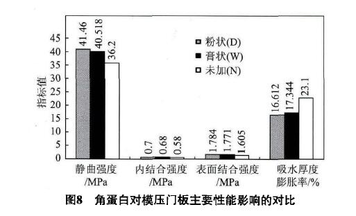 D、W型角蛋白均添加8%,壓制吸塑門板瀏定靜曲強度和表結合強度,添加10%測定內結合強度和吸水厚度膨脹率,同時與未添加改性劑(N)壓制的模壓板材的主要性能指標進行對比試驗,結果如圖8所示。